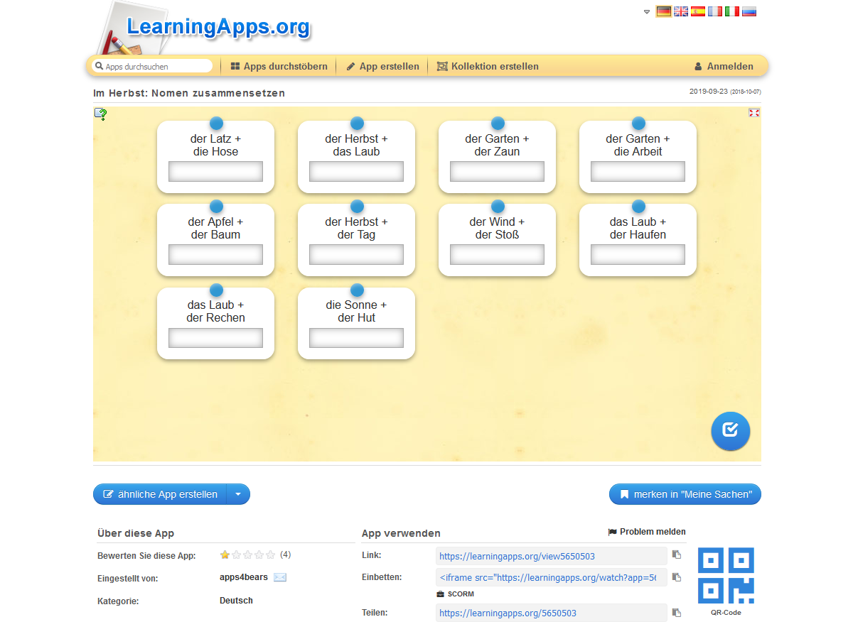 Nach einem Klick auf „mehr“ innerhalb einer Übung gibt Ihnen die Beschreibung Auskunft über die Art der Aufgabe (z.B. Lückentext, Zuordnungsaufgabe, Puzzle etc.), die Anzahl der zu übenden Wörter und über den Autor der Aufgabe. Ihnen werden ebenso die entsprechende Rechtschreibkategorie, die Kategorisierung auf der Kinderseite und der Schwierigkeitsgrad der Übung angezeigt.